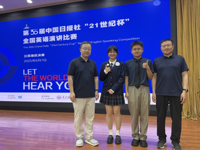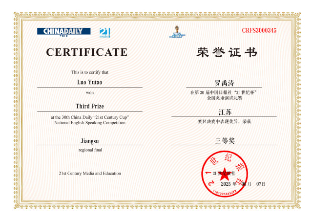 6月7日,第30届中国日报社“21世纪杯”全国英语演讲比赛江苏省赛决赛在南京理工大学圆满落幕。公司选派两名优秀学子参赛,凭借出色的英语表达能力、严密的逻辑思维能力、迅速现场反应力及出色的舞台表现力,william威廉英国官网金奕彤同学在来自南京大学、东南大学、南京理工大学等全省80名优秀参赛选手的激烈竞争中脱颖而出,荣获江苏省一等奖,顺利晋级国赛,罗禹涛荣获江苏省三等奖。金奕彤同学作为优秀选手,接受21世纪报记者视频采访。