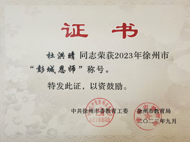 近日,公司杜洪晴老师荣获徐州市“彭城恩师”称号。杜洪晴老师从教15年来,一直坚守初心,淡泊名利。作为外院教工第二党支部书记,她能坚定理想信念,提升师德修养,强化党建+专业“双融合、双促进”,带头开展课程思政改革,获批多项课程思政课题,主持2个优秀教学团队。作为英语专业教研室主任,她敢于担当,带领老师在建设省级一流专业、一流课程、混合教改等方面全面深化改革,多次举办全校公开示范课、教学沙龙和讲座,为公司的发展做出了突出贡献。杜老师教学成果丰硕,发表论文30余篇,主编教材1部,主持省社科基金、省级一流课程、省高校哲学课题、校级在线开放课程等20余项,获得各类省级教学竞赛、校“优秀主讲教师”、校“最美教师”等教学奖励20余项。