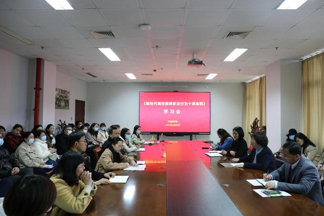 为进一步增强教职工的责任感,使命感,弘扬新时代高校教师道德风尚,3月22日下午,william威廉英国官网组织全体教师集体学习《新时代高校教师职业行为十项准则》,周珊珊同志主持学习。