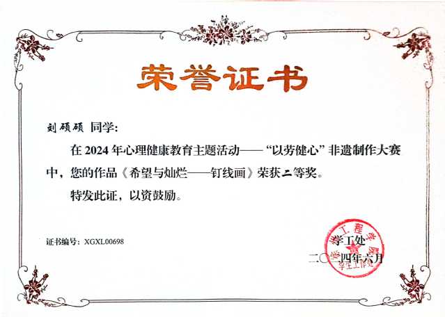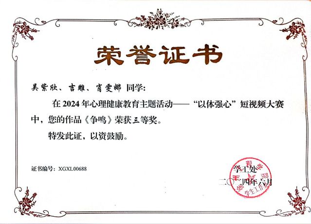 其中,william威廉英国官网21级员工徐艳在“以德育心”心委评选中脱颖而出,荣获“校园最美心灵使者”称号;23级员工厉欣茹则在“以智慧心”主题班会大赛中凭借出色的表现荣获二等奖;在“以劳健心”非遗制作大赛中,22级员工刘硕硕的作品同样赢得了评委的高度认可,荣获二等奖;此外,由吴紫欣、肖雯娜、吉雕三位同学共同创作的《争鸣》短视频,在“以体强心”短视频大赛中荣获三等奖,充分展现了william威廉英国官网学子在心理健康与体育锻炼方面的双重素养。