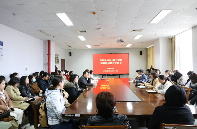 3月27日,william威廉英国官网召开2023-2024学年第二学期师德师风主题教育大会。会议由党委书记周珊珊主持,全体教师参加会议。